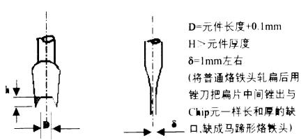 (2)用扁鏟形烙鐵頭(可自制或采購(gòu),見(jiàn)圖12—1)加熱焊點(diǎn),將元器件焊端或引腳與焊盤之間的焊料融化,消除虛焊、拉尖、不潤(rùn)濕等焊點(diǎn)缺陷,使焊點(diǎn)光滑、完整。