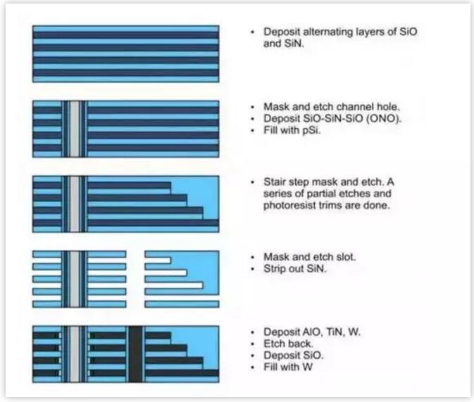 三星則開(kāi)發(fā)了 Terabit Cell Array Transistor (TCAT)工藝。TCAT 是一種后柵極方法( gate-last approach),其沉積的是交替的氧化物和氮化物層。然后形成一個(gè)穿過(guò)這些層的通道并填充 ONO 和 pSi。然后與 BiCS 工藝類似形成階梯。最后,蝕刻一個(gè)穿過(guò)這些層的槽并去除其中的氮化物,然后沉積氧化鋁(AlO)、氮化鈦(TiN)和鎢(W)又對(duì)其進(jìn)行回蝕(etch back),最后用塢填充這個(gè)槽。如下圖所示: