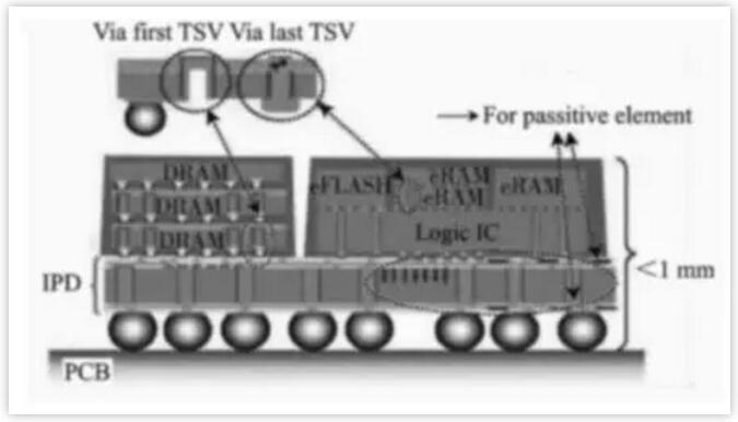 在這種3D集成技術(shù)中,至少有一顆裸芯片與另一顆裸芯片疊放在一起,下方的那顆裸芯片是采用TSV技術(shù),通過(guò)TSV讓上方的裸芯片與下方裸芯片、SiP基板通訊。如下圖所示: