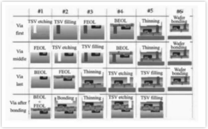 根據(jù)通孔制作的時(shí)間不同,3D TSV通孔集成方式可以分為四類: