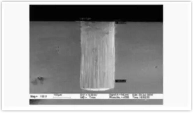 圓片上通孔制造是TSV技術(shù)的核心,目前,鉆蝕TSV技術(shù)主要有兩種,一種是干法刻蝕或稱博世刻蝕,另一種是激光刻蝕。博世工藝為MEMS工藝而開(kāi)發(fā),快速地在去除硅的SF6等離子刻蝕和實(shí)現(xiàn)側(cè)壁鈍化的C4F8等離子沉積步驟之間循環(huán)切換。下圖為南京電子器件所(NEDI)利用博世工藝制作的TSV硅通孔。