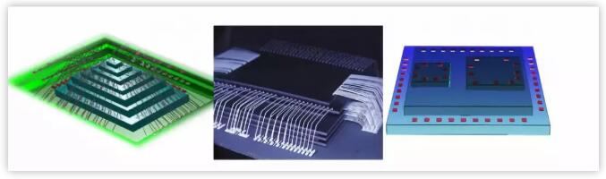 3D IC的初期型態(tài),目前仍廣泛應(yīng)用于SiP領(lǐng)域,是將功能相同的裸芯片從下至上堆在一起,形成3D堆疊,再由兩側(cè)的鍵合線連接,最后以系統(tǒng)級(jí)封裝(System-in-Package,SiP)的外觀呈現(xiàn)。堆疊的方式可為金字塔形、懸臂形、并排堆疊等多種方式,參看下圖。