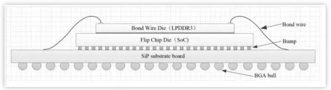 另一種常見(jiàn)的方式是將一顆倒裝焊(flip-chip)裸芯片安裝在SiP基板上,另外一顆裸芯片以鍵合的方式安裝在其上方,如下圖所示,這種3D解決方案在手機(jī)中比較常用。