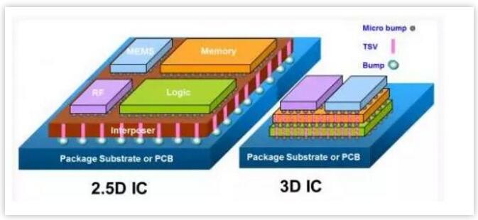下圖顯示了無(wú)源TSV和有源TSV分別對(duì)應(yīng)的2.5D和3D技術(shù)。