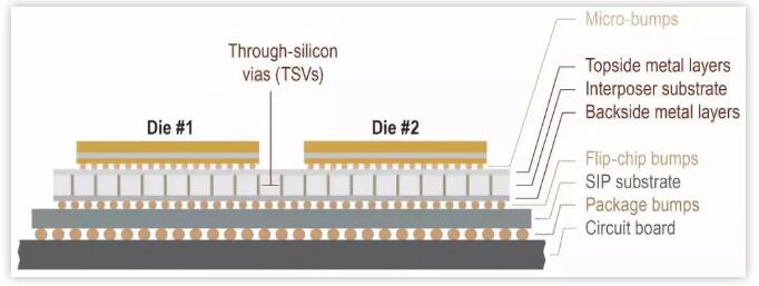 在SiP基板與裸芯片之間放置一個(gè)中介層(interposer)硅基板,中介層具備硅通孔(TSV),通過(guò)TSV連結(jié)硅基板上方與下方表面的金屬層。有人將這種技術(shù)稱為2.5D,因?yàn)樽鳛橹薪閷拥墓杌迨菬o(wú)源被動(dòng)元件,TSV硅通孔并沒(méi)有打在芯片本身上。如下圖所示: