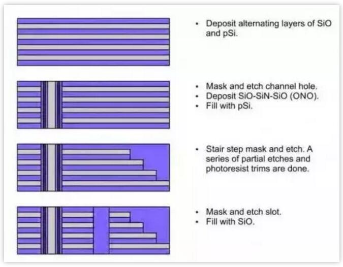東芝開(kāi)發(fā)了 Bit Cost Scalable(BiCS)的工藝。BiCS 工藝采用了一種先柵極方法(gate-first approach),這是通過(guò)交替沉積氧化物(SiO)層和多晶硅(pSi)層實(shí)現(xiàn)的。然后在這個(gè)層堆疊中形成一個(gè)通道孔,并填充氧化物-氮化物-氧化物(ONO)和 pSi。然后沉積光刻膠,通過(guò)一個(gè)連續(xù)的蝕刻流程,光刻膠修整并蝕刻出一個(gè)階梯,形成互連。最后再蝕刻出一個(gè)槽并填充氧化物。如下圖所示: